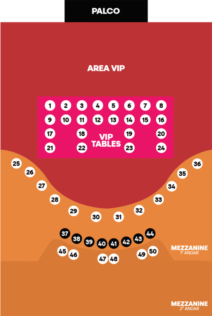 VIP TABLES: Exclusive numbered tables, ideal for those seeking comfort, premium service, and a privileged view of the stage. This area is limited and available only through reservation.